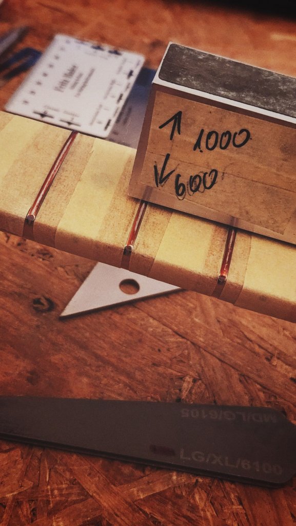 Es gab nur das, was der Baumarkt oder der Schuppen so hergab. Ein paar Feilen, Malerkrepp, Inbusschlüssel, irgendein Lineal und Polierkram. Mehr hatte ich auch nicht. Und glücklicherweise damals keine Gitarre mit Edelstahlbünden vor mir. Wäre das der Fall gewesen, hätte ich mich da wahrscheinlich nie mehr ran gewagt. Edelstahlbünde lassen sich, im krassen Gegensatz zu Bünden aus Nickel, entsprechend schwerer bearbeiten (kleiner Tipp am Rande: Bundfeilen mit Diamantbeschichtung finden in Bünden aus Edelstahl ihren überlegenen Endgegner. Sollte man wissen).